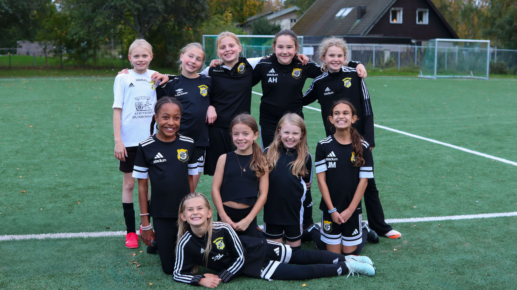 fotbollslag sitter på en fotbollsplan